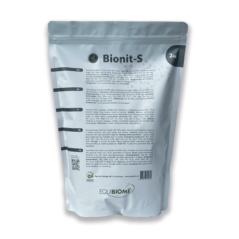 OBS! Pga Bionit-S höga absorptionsförmåga bör den ej ges vid förstoppningssymtom eller kolikkänsliga hästar.