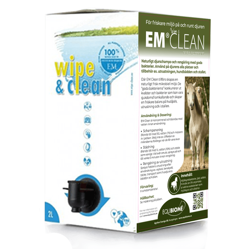 EM Clean är en probiotisk rengöring med goda bakterier som kan användas både som djurschampo och för rengöring av djurens utrustning och miljöer. Goda bakterierna har bland annat förmågan att konkurrerar ut kvalster och de bakterier som kan skapa hudproblem och vara sjukdomsframkallande. Där probiotika tillförs skapas en naturligt hälsosam mikrobiell miljö, en friskare balans på hudens mikrobiom samt en fräsch miljö på utrustningen och i djurstallet.