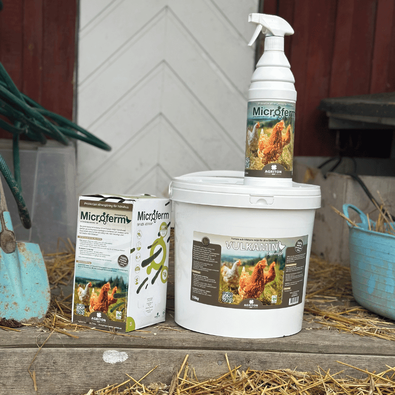Produkterna samverkar med varandra för ett bra klimat, mikrobiell balans och god hygien. Genom att använda dessa två tillsammans bryts gödsel ner redan i hönshuset vilket minskar antalet parasiter och flugor.